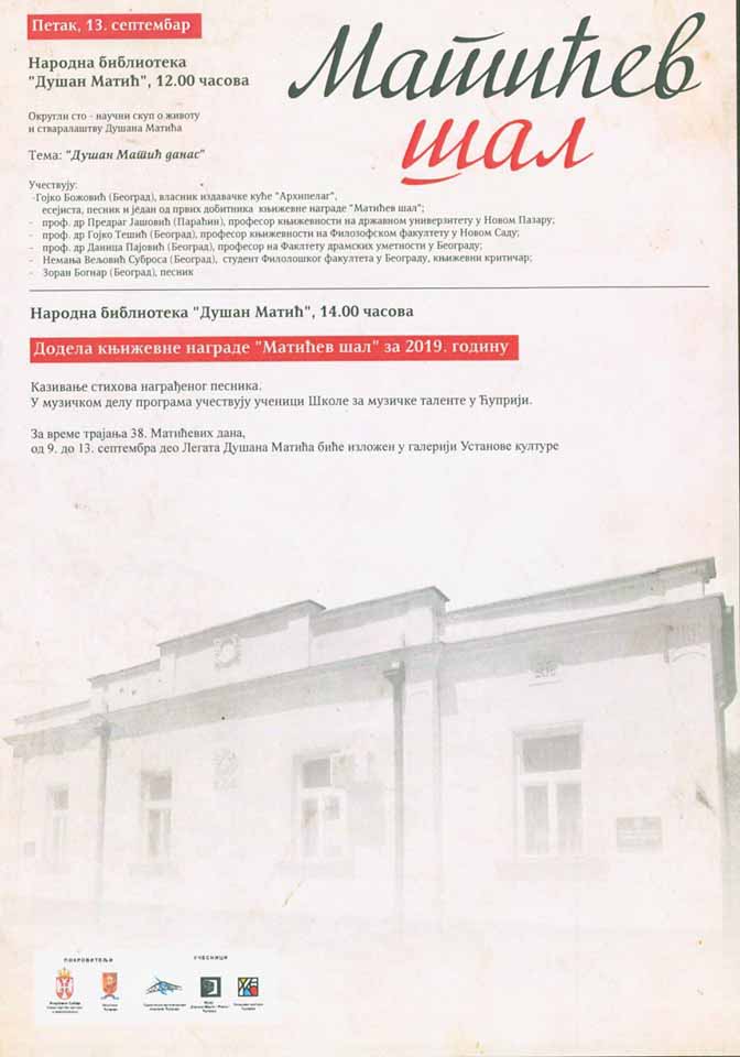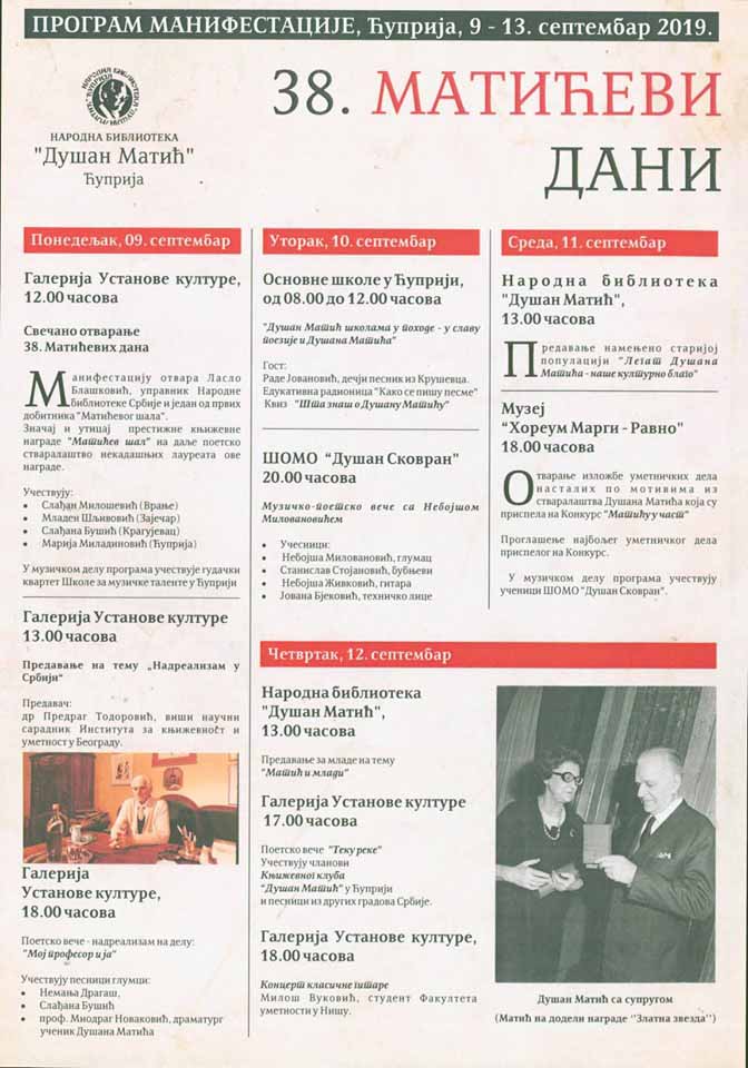 Од 9. до 13. септембра одржаће се манифестација Матићеви дани, 38. по реду. Грађане Ћуприје очекује разноврстан програм током целе недеље. На распореду су поетске вечери, предавања, радионице, изложба и концерт класичне гитаре, а додатно о програму можете погледати на постеру испод: